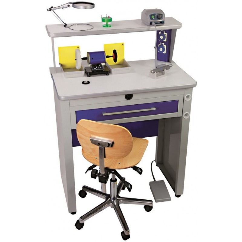 Mesa de trabalho cinza e roxa com ferramentas e cadeira giratória de madeira clara