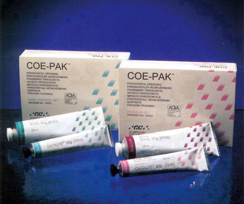 • Caixas e tubos de material para impressão periodontal COE-PAK azul e rosa sobre fundo azul
