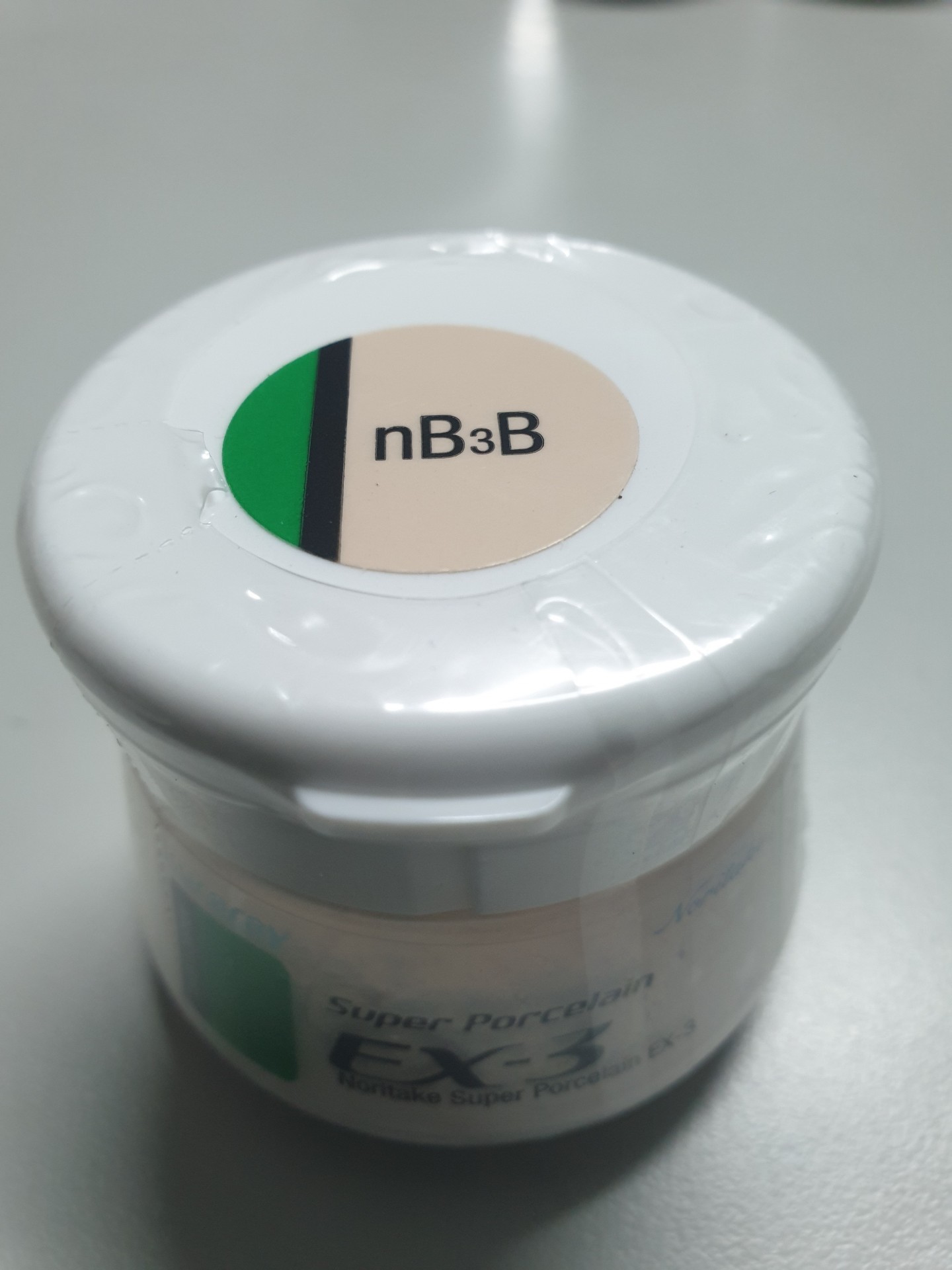 Frasco branco pequeno com etiqueta 'nB3B' na tampa