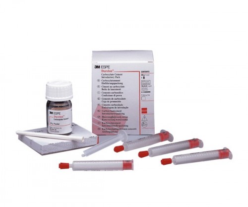 • Material dentário 3M ESPE Duraflex com frasco, caixas e seringas sobre fundo branco