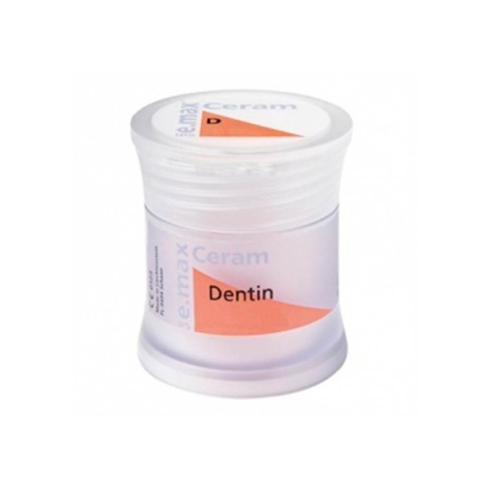 • Recipiente pequeno translúcido com material dental e rótulo e.max Ceram Dentin