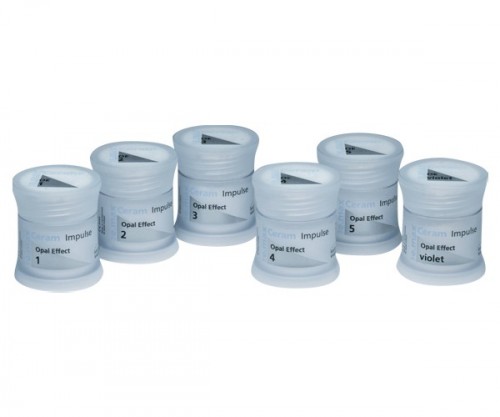 • Seis potes brancos com tampas transparentes e etiquetas com texto Opal Effect e números