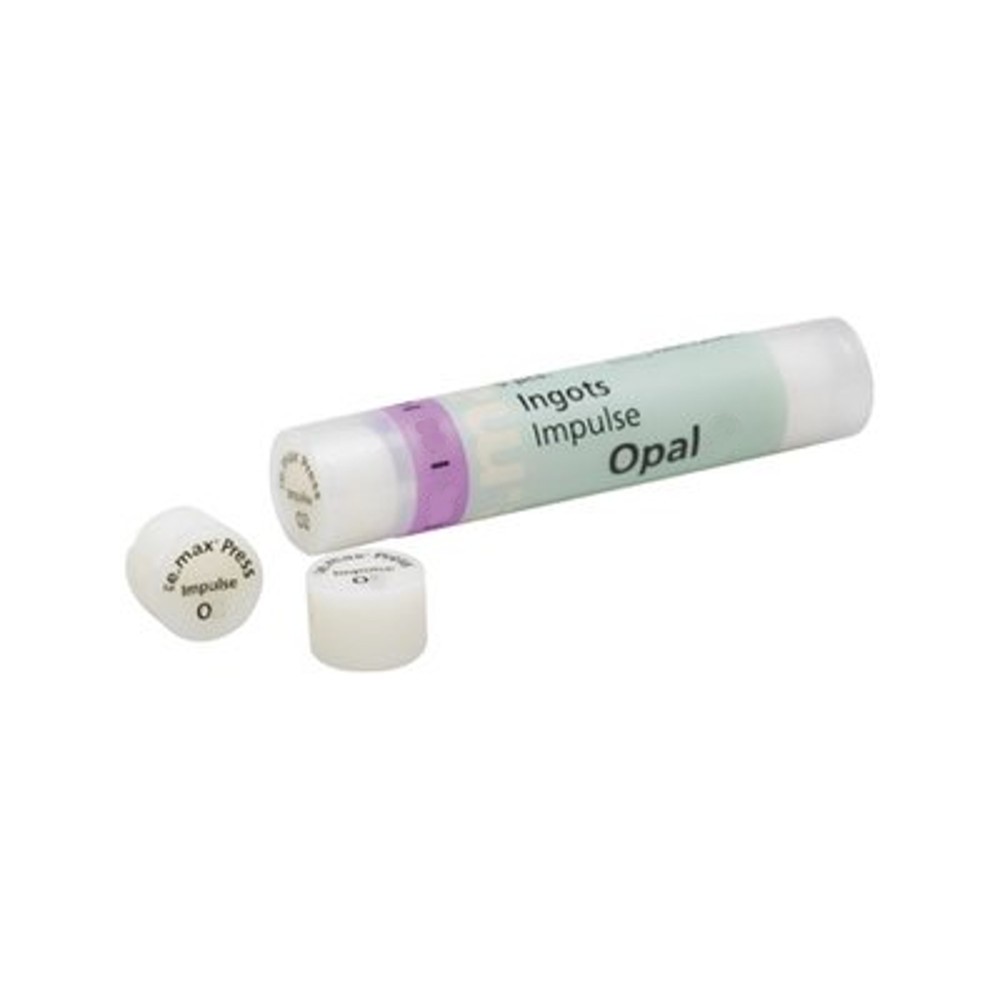 Tubo transparente com pastilhas brancas redondas, rótulo 'Ingots Impulse Opal', fundo branco.