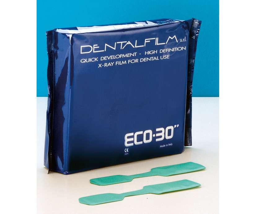 • Pacote azul de filme para raios-x dentário com duas folhas verdes ao lado