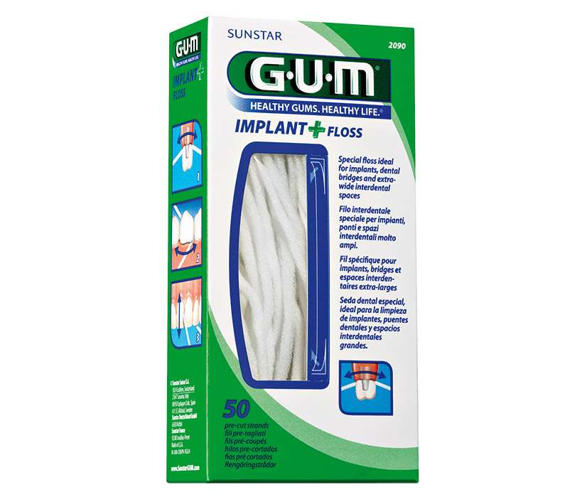 • Caixa de fio dental GUM IMPLANT + FLOSS, verde e branca, com janela mostrando o fio dental branco enrolado.