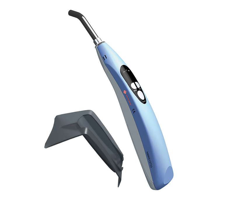 Caneta de luz azul clara com suporte cinzento em fundo branco