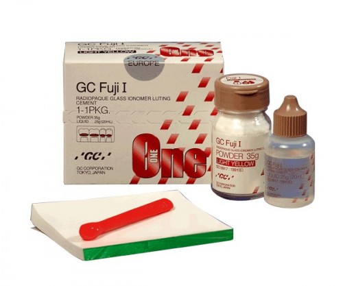 Produto dentário GC Fuji I com embalagem, frascos, espátula vermelha e bandeja para mistura
