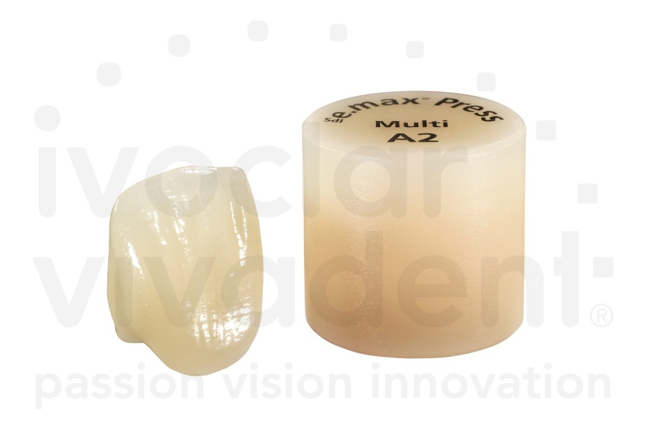 • Coroa dental cerâmica translúcida com cilindro opaco rotulado Empress Multi A2