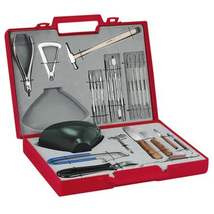 • Estojo vermelho aberto com instrumentos cirúrgicos variados de metal e bisturis com cabo de madeira