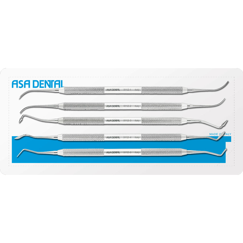 • Conjunto de instrumentos dentários metálicos com cabos texturizados e pontas curvas, sobre base branca e azul com texto