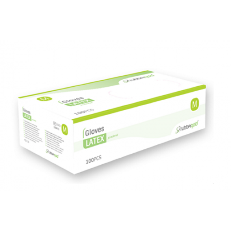 • Caixa de luvas de látex tamanho M com design branco e verde