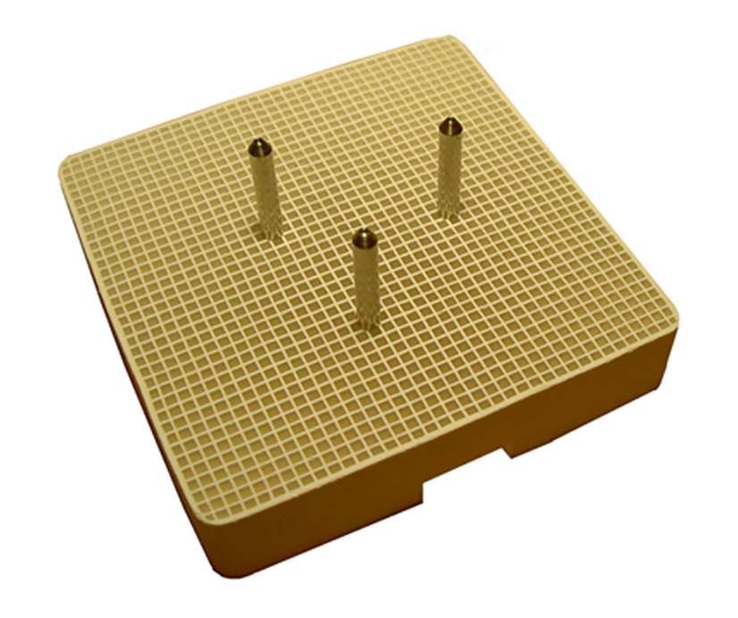 Suporte quadrado amarelo com textura de grelha e três hastes metálicas
