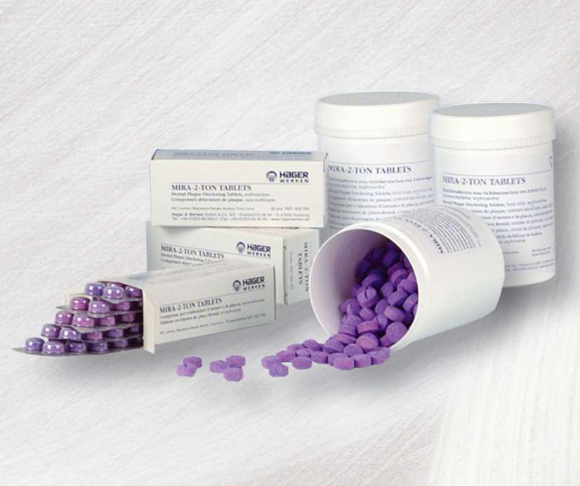 • Frascos e caixas brancas com comprimidos roxos, rótulos com texto Mira-Z-Ton Tablets