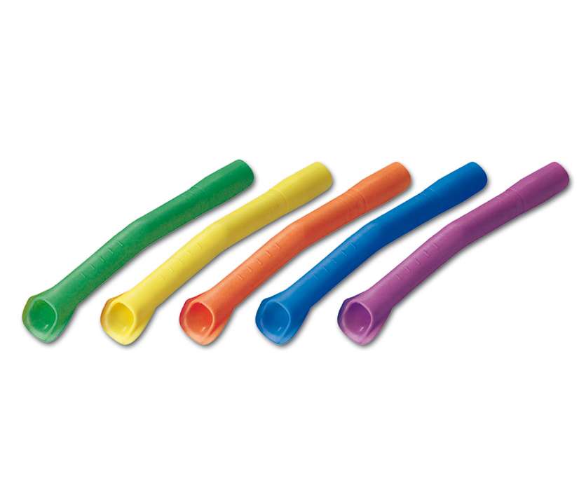 • Cinco tubos coloridos flexíveis em linha sobre fundo branco