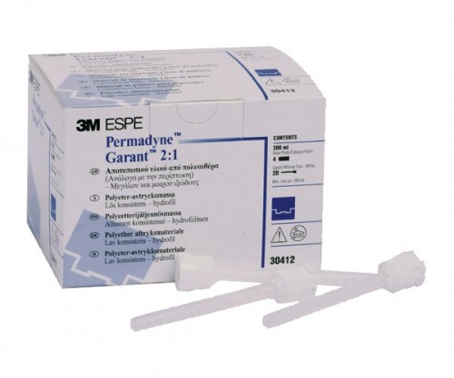 • Embalagem branca e azul do produto 3M ESPE Permadyne Garant 2:1 com aplicadores