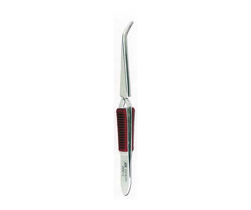 • Pinça metálica com ponta curvada e cabo antiderrapante vermelho