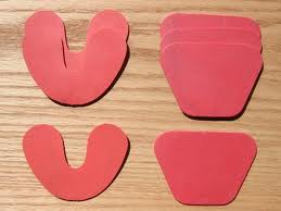 Protetores de silicone vermelhos em formatos U e trapezoidais sobre madeira clara