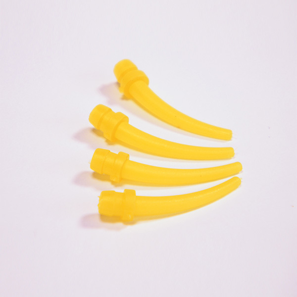 Quatro peças amarelas de plástico curvadas sobre fundo branco