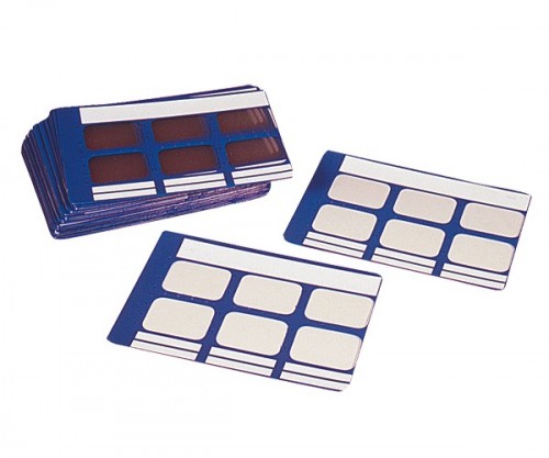 • Etiquetas adesivas retangulares brancas com bordas azuis e linhas pretas