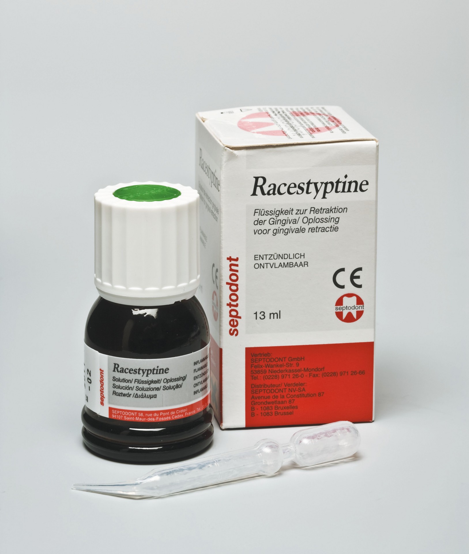 • Frasco do produto Racestyptine da Septodont com embalagem e conta-gotas