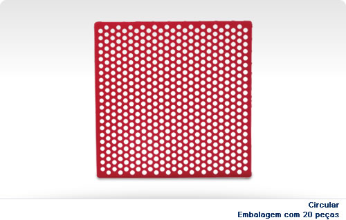 • Tapete circular vermelho com padrão de furos e embalagem com 20 peças