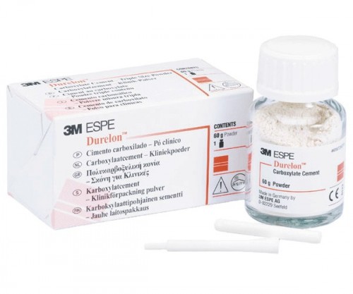 Embalagem e frasco de cimento carboxilato 3M ESPE Durelon com pó branco e tampa branca