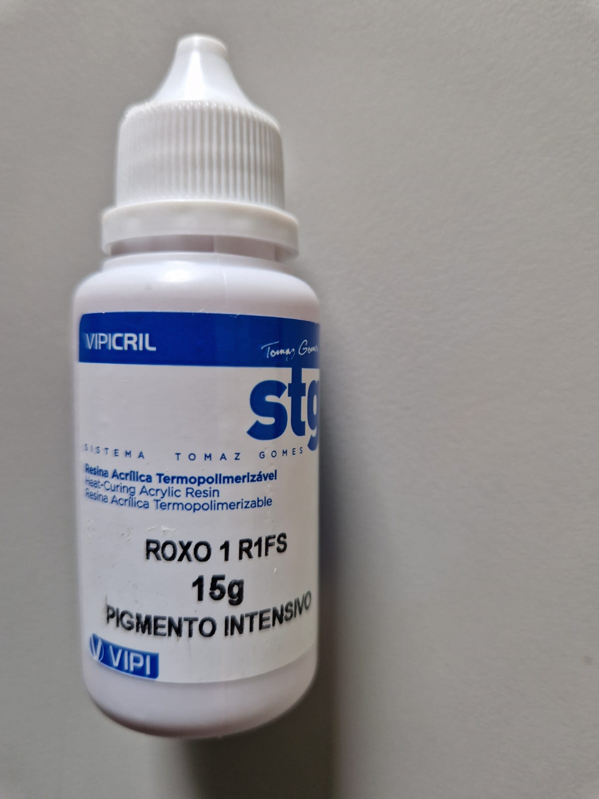 • Frasco branco de resina acrílica termopolimerizável roxo com rótulo azul e branco