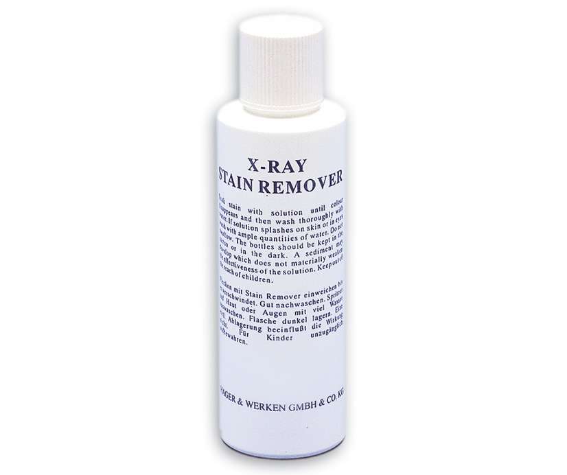 • Frasco branco de removedor de manchas X-RAY com texto em preto.