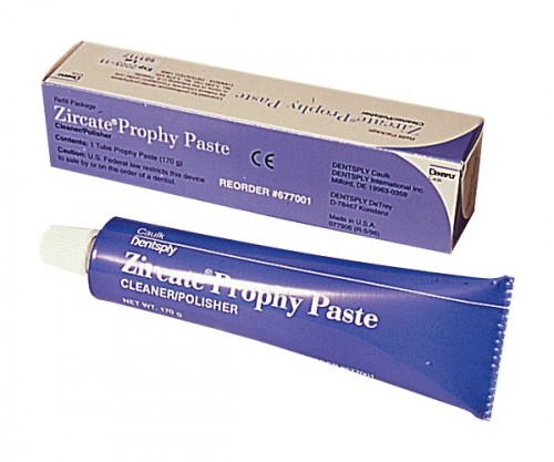 • Tubinho azul e embalagem branca de Zircate Trophy Paste para polimento dental